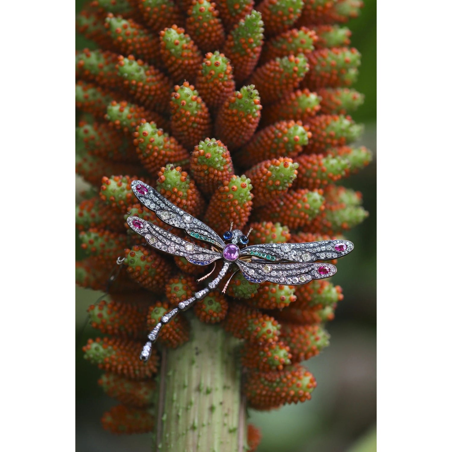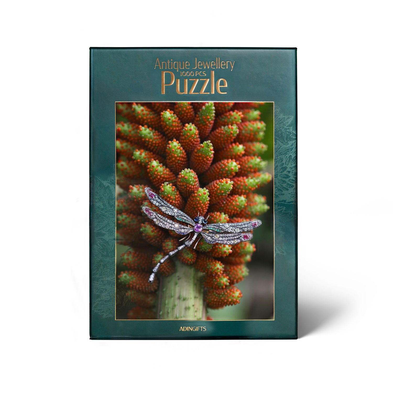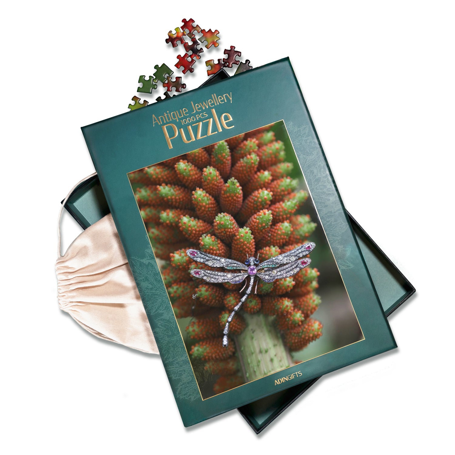 1000-piece jigsaw puzzle, featuring a bejeweled dragonfly brooch from the late 19th century, set against a lush floral backdrop.